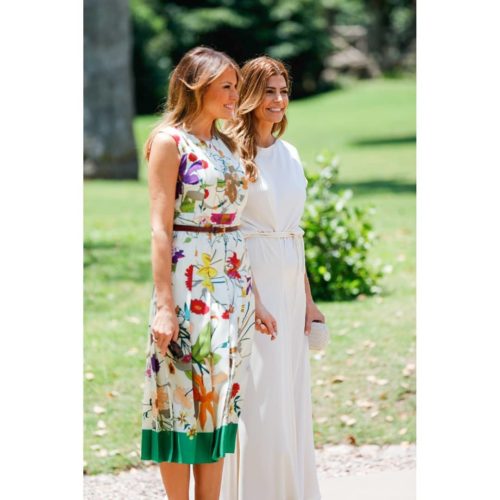 У театрі Колон Трамп була помічена в наряді пурпурного кольору з тонким поясом від Reem Acra, яке доповнила золотистими човниками від Christian Louboutin. Для другого дня саміту перша леді віддала перевагу кремове плаття від Diоr в горошок за 10 тисяч доларів. На плечі Меланія накинула бежеве пальто.